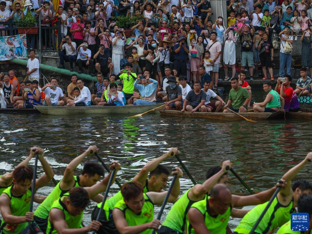 6月22日,佛山疊滘河涌?jì)砂渡踔了系教幨怯^(guān)看龍船漂移的觀(guān)眾。