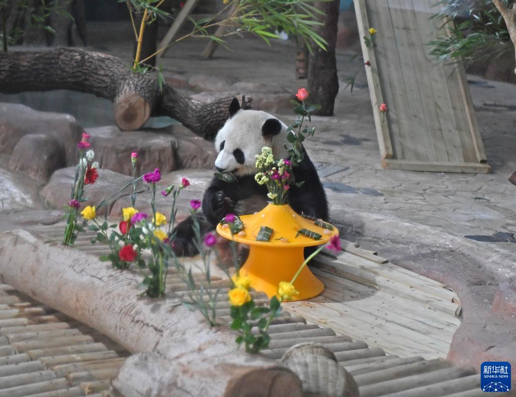 6月23日,大熊貓“績(jì)美”在享受美食。