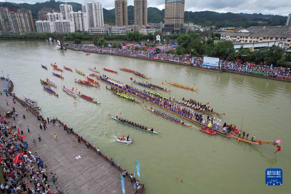 6月23日,在貴州省黔東南苗族侗族自治州施秉縣舉行的獨木龍舟節上,獨木龍舟進(jìn)行水上巡游(無(wú)人機照片)。