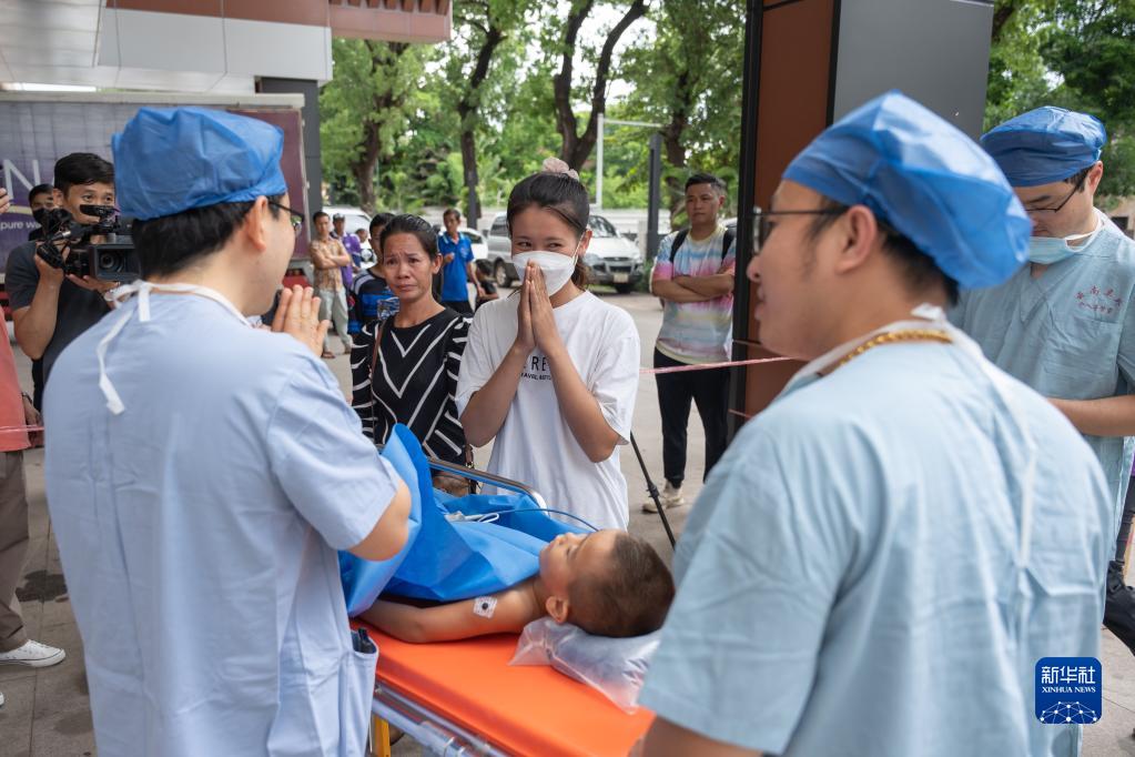 6月20日,在老撾首都萬(wàn)象瑪霍索醫院,患病兒童在移動(dòng)介入治療手術(shù)車(chē)完成治療后,中國醫生叮囑孩子家人。