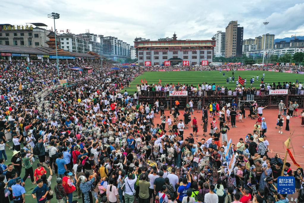 6月23日,表演方隊進(jìn)入“村超”球賽現場(chǎng)(無(wú)人機照片)。