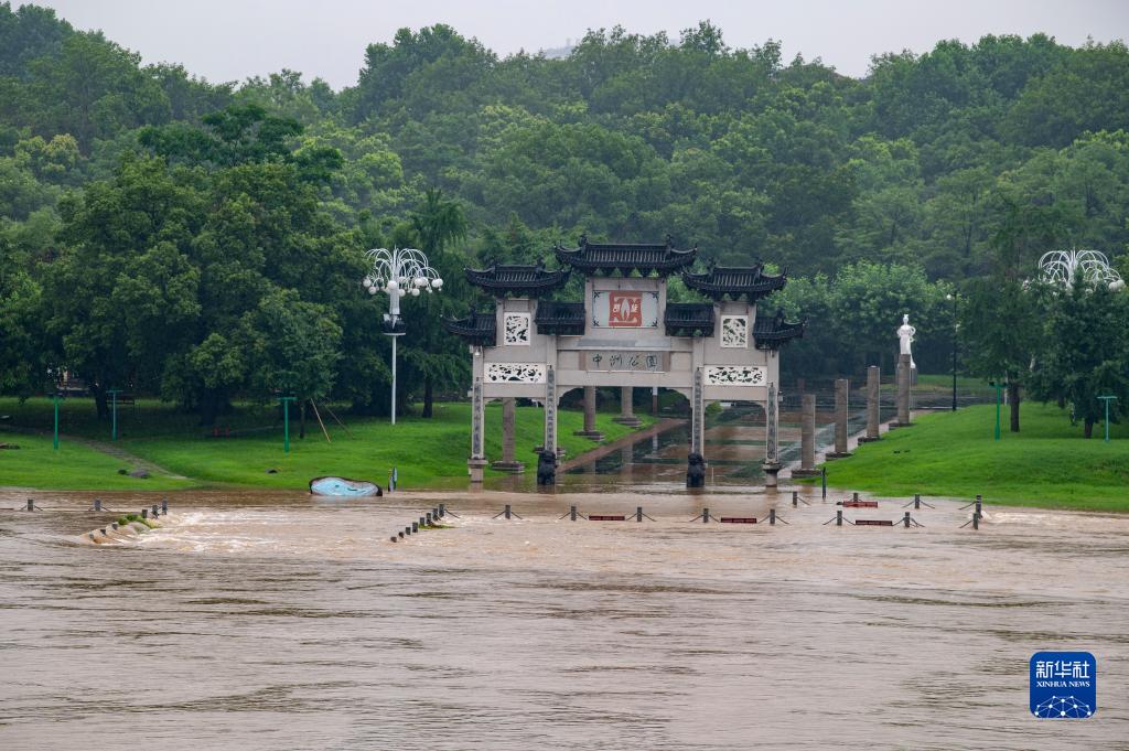 6月24日,在浙江省蘭溪市,蘭江水位漫過(guò)江邊公園道路。