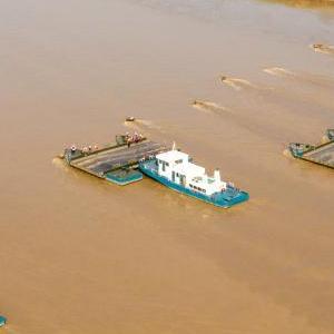 6月23日,作業(yè)船只拆除黃河山東段高青縣翟家寺浮橋(無(wú)人機照片)。