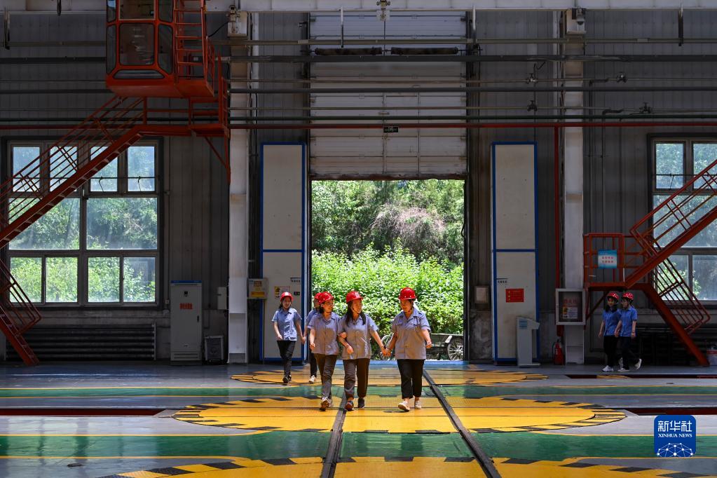 在中國鐵路太原局集團有限公司太原機務(wù)段太北檢修車(chē)間,部分天車(chē)司機結束作業(yè)后走出車(chē)間(6月20日攝)。