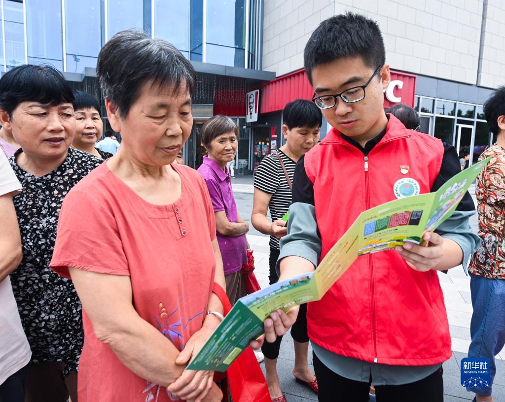6月25日,杭州市生態(tài)環(huán)境局臨安分局的黨員志愿者(右)向居民發(fā)送生態(tài)環(huán)境類(lèi)宣傳資料。