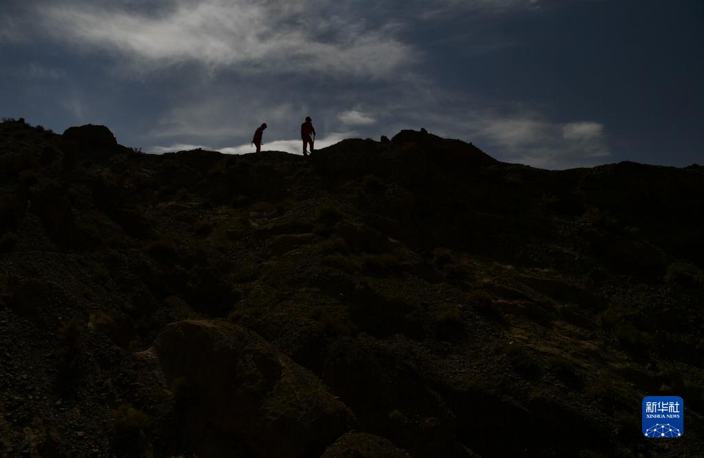 東方物探公司塔里木物探處2170隊放線(xiàn)班組的工人在山間施工(6月20日攝)。