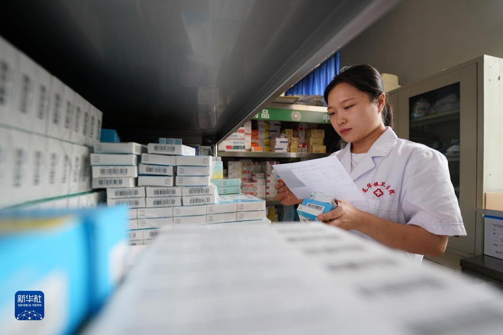 6月25日,河北省柏鄉縣龍華鎮衛生院藥房工作人員在為患者取藥。