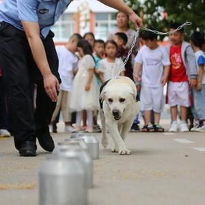 6月25日,山東省沂南縣公安局在辛集鎮中心小學(xué)開(kāi)展禁毒主題宣傳活動(dòng),給小朋友演示緝毒犬嗅毒。
