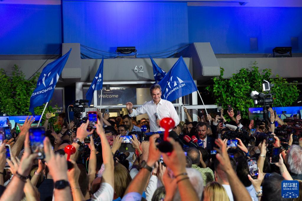 6月25日,希臘新民主黨領(lǐng)導人基里亞科斯·米佐塔基斯在雅典與支持者慶祝該黨派贏(yíng)得選舉。