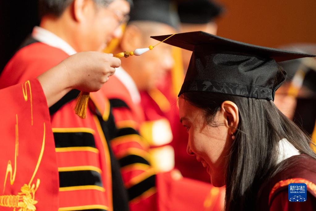 6月26日,在中國人民大學(xué)2023年學(xué)位授予儀式現場(chǎng),一名學(xué)生參加撥穗儀式。