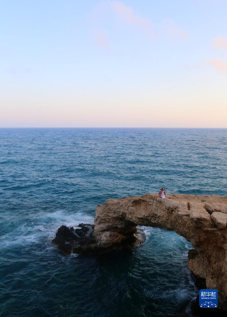 在塞浦路斯圣納帕東部海蝕洞景區,一處海岸邊海水侵蝕后形成的天然石橋“愛(ài)之橋”因美麗的景色成為游客打卡地。