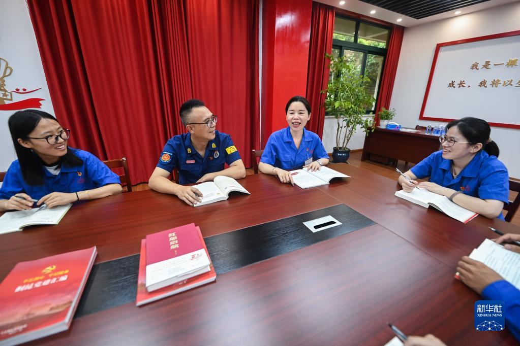 6月27日,胡曉麗(右二)等黨員職工在桐昆集團的工作室內開(kāi)展主題黨日活動(dòng)。
