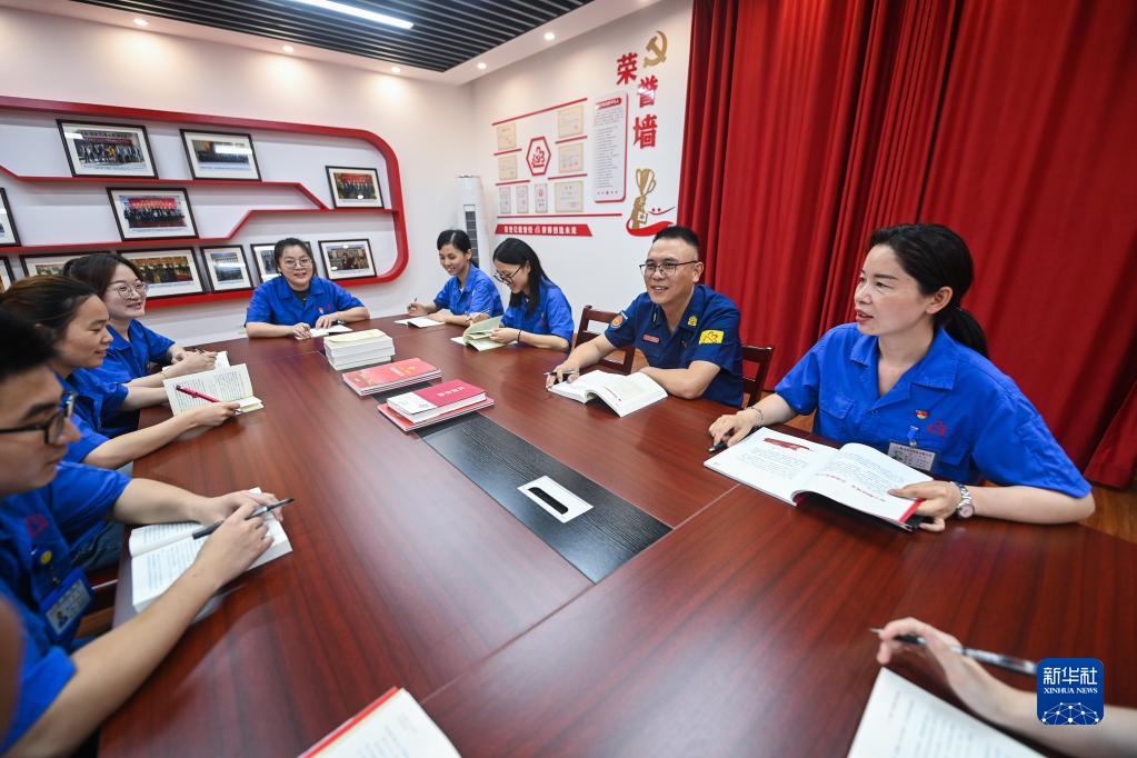 6月27日,胡曉麗(右一)等黨員職工在桐昆集團的工作室內開(kāi)展主題黨日活動(dòng)。