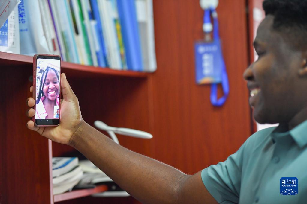 在中南大學(xué)升華留學(xué)生公寓,何丁和在喀麥隆的姐姐視頻聊天(6月14日攝)。