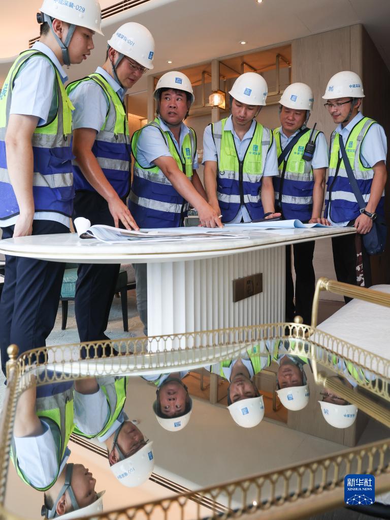 伍濤(左二)和同事在施工現場(chǎng)對裝飾施工效果和設計方案還原程度進(jìn)行比對(6月26日攝)。