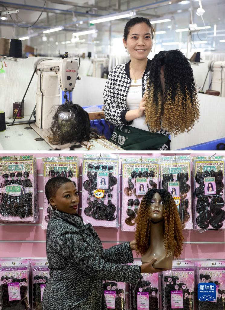 拼版照片:上圖為5月25日,工人在湖南邵陽(yáng)美麗來(lái)發(fā)制品有限公司車(chē)間內展示假發(fā)(新華社記者薛宇舸攝);下圖為6月9日,一名店員在湖南邵陽(yáng)美麗來(lái)發(fā)制品有限公司位于南非約翰內斯堡的的店鋪內展示假發(fā)(新華社記者張譽(yù)東攝)。