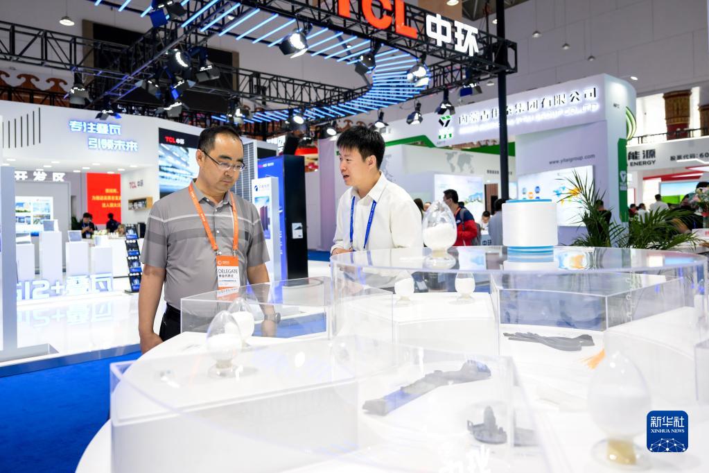 6月28日,參會(huì )人員在2023世界新能源新材料大會(huì )展覽區參觀(guān)。
