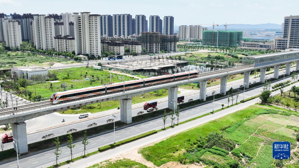 這是在滁州市來(lái)安縣境內拍攝的滁寧城際鐵路列車(chē)(6月28日攝,無(wú)人機照片)。
