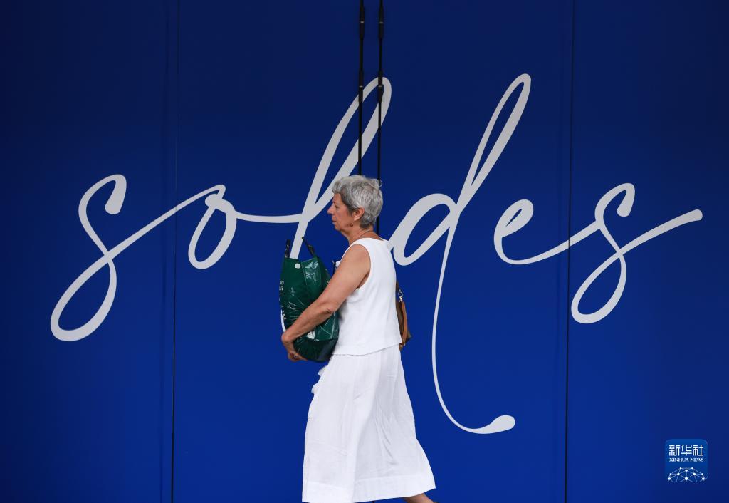 6月28日,一名女子走過(guò)法國巴黎街頭的打折季廣告。