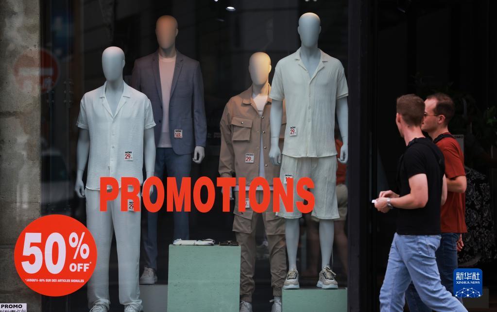 6月28日,人們走過(guò)法國巴黎街頭的打折季廣告。