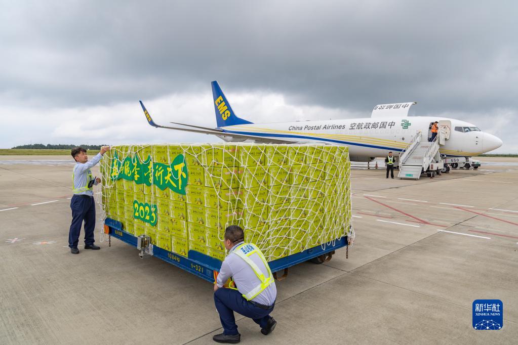 6月28日,在重慶巫山機場(chǎng),工作人員檢查即將由中國郵政航空公司全貨機運送的巫山脆李。