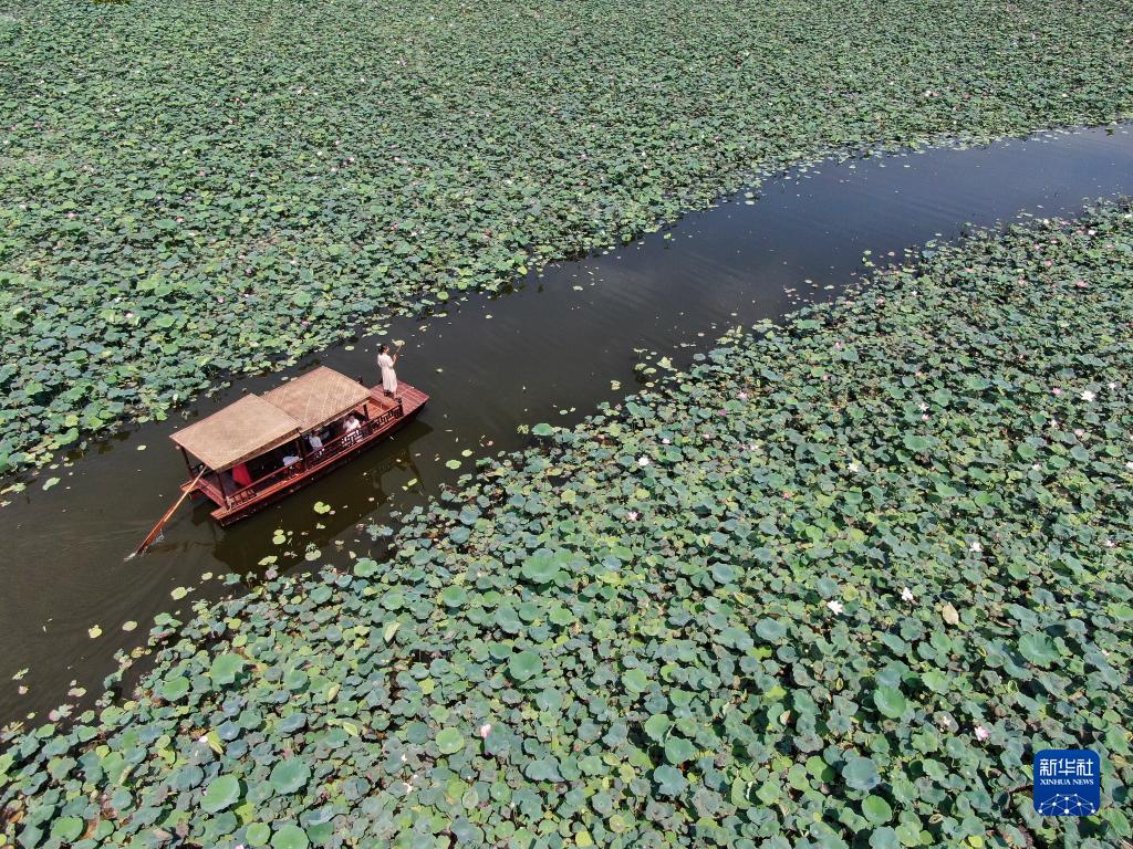 6月18日,游客在云南省景洪市勐罕鎮一處荷塘內乘船賞荷(無(wú)人機照片)。