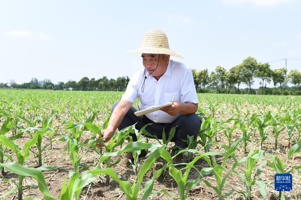 徐淙祥在太和縣淙祥現代農業(yè)種植專(zhuān)業(yè)合作社的高產(chǎn)攻關(guān)示范田里查看苗情(2022年6月28日攝)。