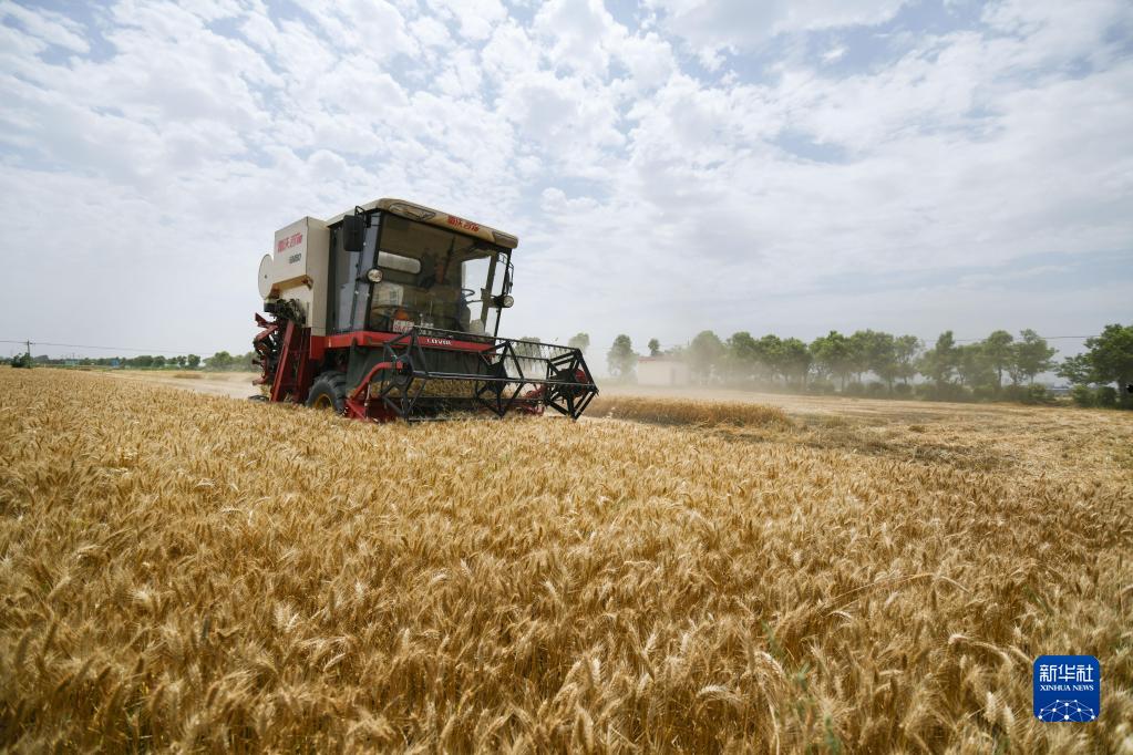 6月2日,在太和縣淙祥現代農業(yè)種植專(zhuān)業(yè)合作社,農機手操作機械設備收割小麥。