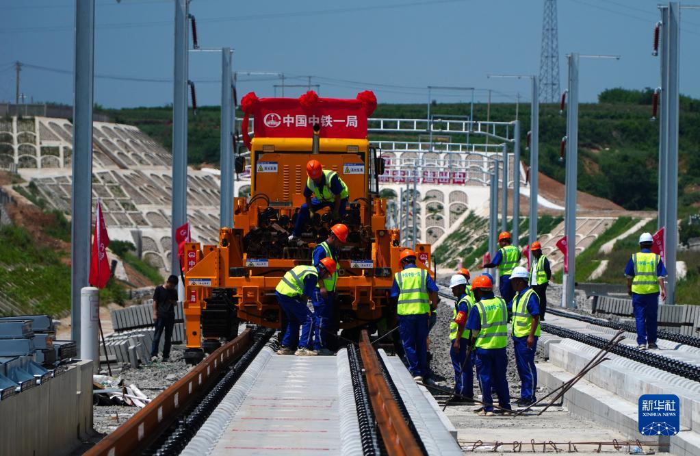 6月30日,在位于山東省煙臺市蓬萊區的濰煙高鐵施工現場(chǎng),中鐵一局鋪軌機組施工人員在進(jìn)行鋪軌作業(yè)。