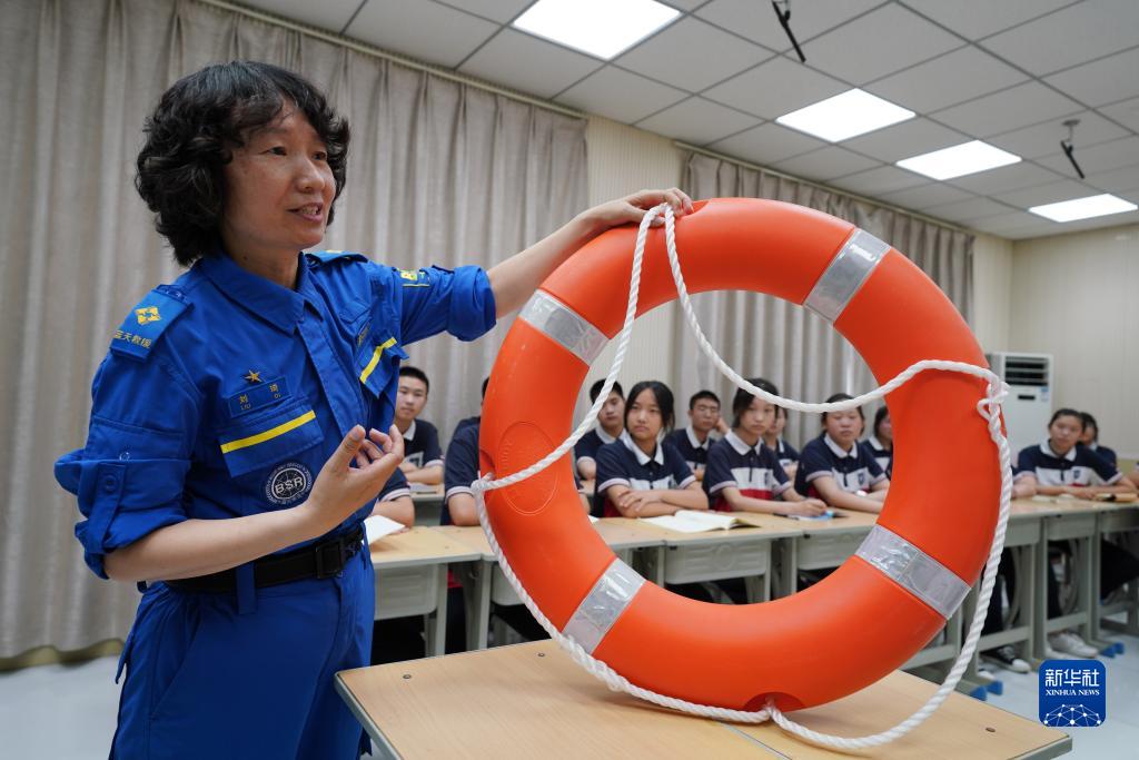 6月30日,河北省邢臺市藍天救援隊志愿者指導邢臺市第八中學(xué)學(xué)生使用救生圈。