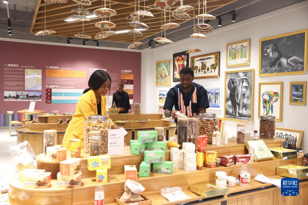 6月25日,在中非經(jīng)貿合作促進(jìn)創(chuàng )新示范園(湖南高橋大市場(chǎng)),來(lái)自贊比亞的志愿者卡賓(左)、來(lái)自剛果(金)的志愿者利法齊(中)和來(lái)自加納的志愿者高猛(右)在第三屆中非經(jīng)貿博覽會(huì )開(kāi)幕前布置展品。