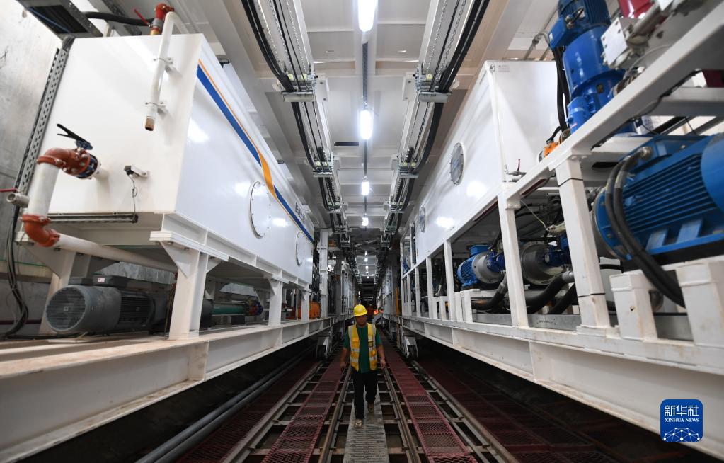 6月30日,工人在廣東佛山市獅山鎮獅山1號隧道中鐵四局城軌分公司“初心號”盾構機內部巡查設備。