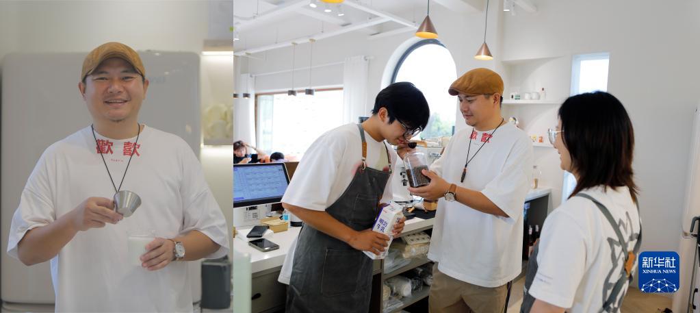 拼版照片:左圖為6月30日拍攝的如東無(wú)名之輩咖啡店店主陳維華;右圖為6月30日,陳維華向員工介紹店內的新品咖啡豆。