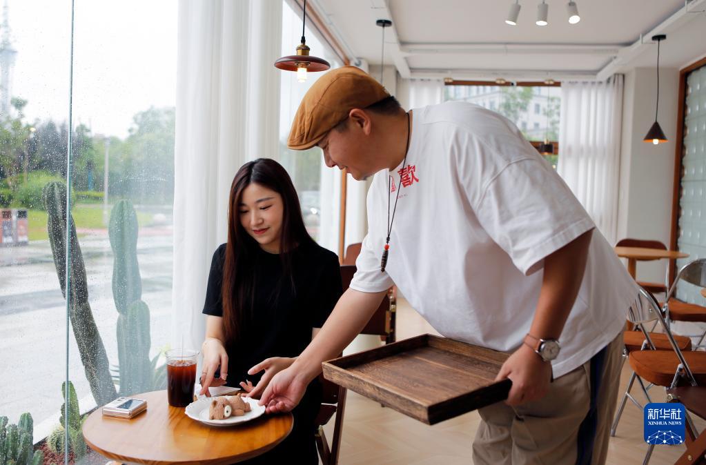 6月30日,在如東無(wú)名之輩咖啡店,店主陳維華給客人端上咖啡。