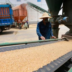 6月30日,在淮北市濉溪縣韓村鎮一家食品企業(yè)夏糧收購現場(chǎng),工人在自動(dòng)化傳輸線(xiàn)旁作業(yè)。