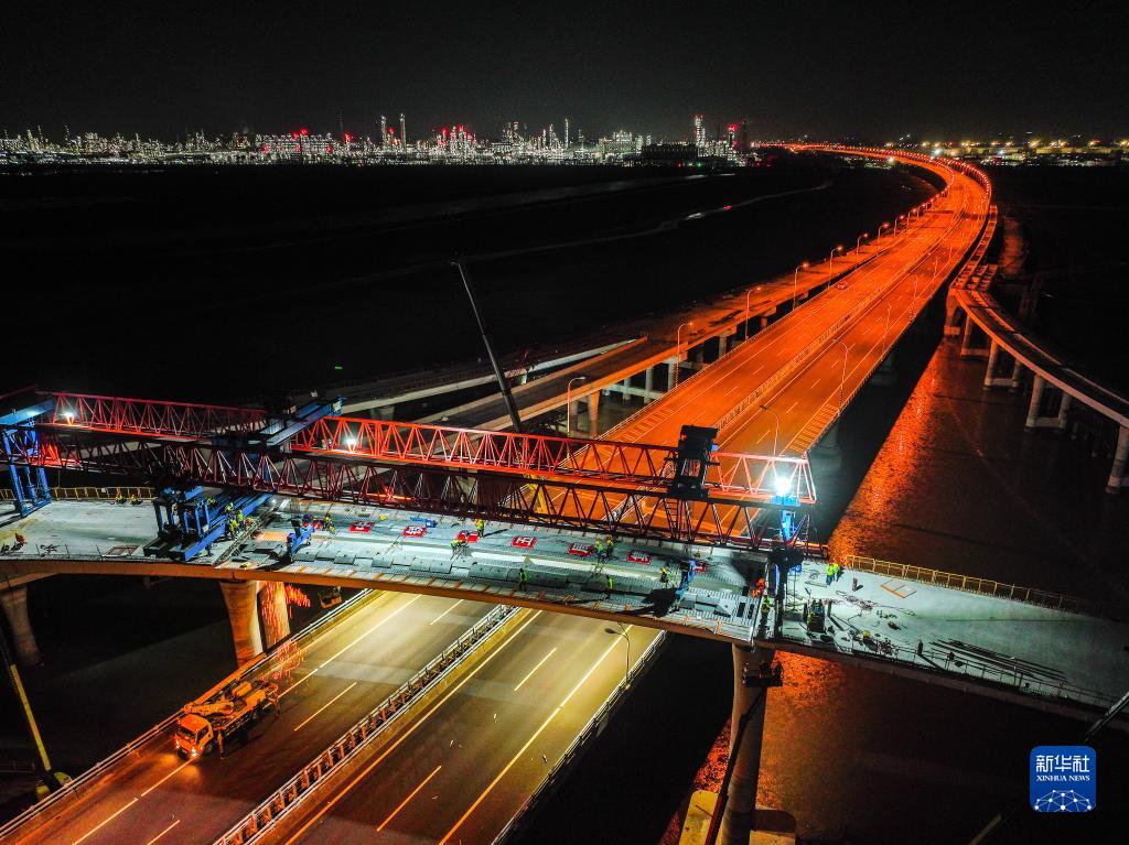 當日,在杭甬復線(xiàn)寧波一期濱?;ネㄊ┕がF場(chǎng),濱?;ネɡ^主線(xiàn)和F匝道兩次上跨之后,第三次成功跨越金塘大橋,為實(shí)現年底建成目標邁出重要一步。新華社發(fā)(姚峰攝)