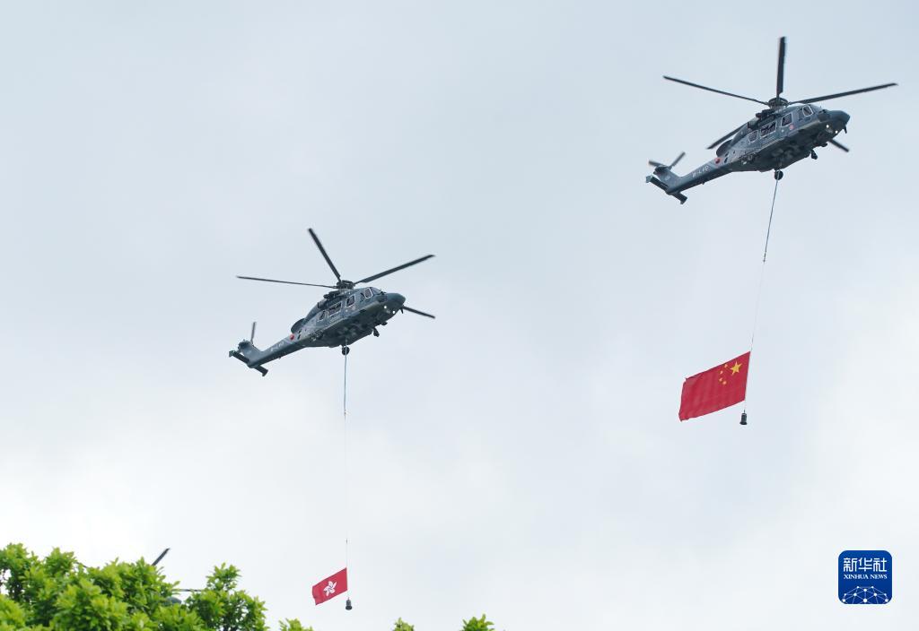 7月1日,香港特區政府在金紫荊廣場(chǎng)舉行升旗儀式,慶祝香港回歸祖國26周年。這是分別懸掛中華人民共和國國旗、香港特區區旗的直升機從空中飛過(guò)。
