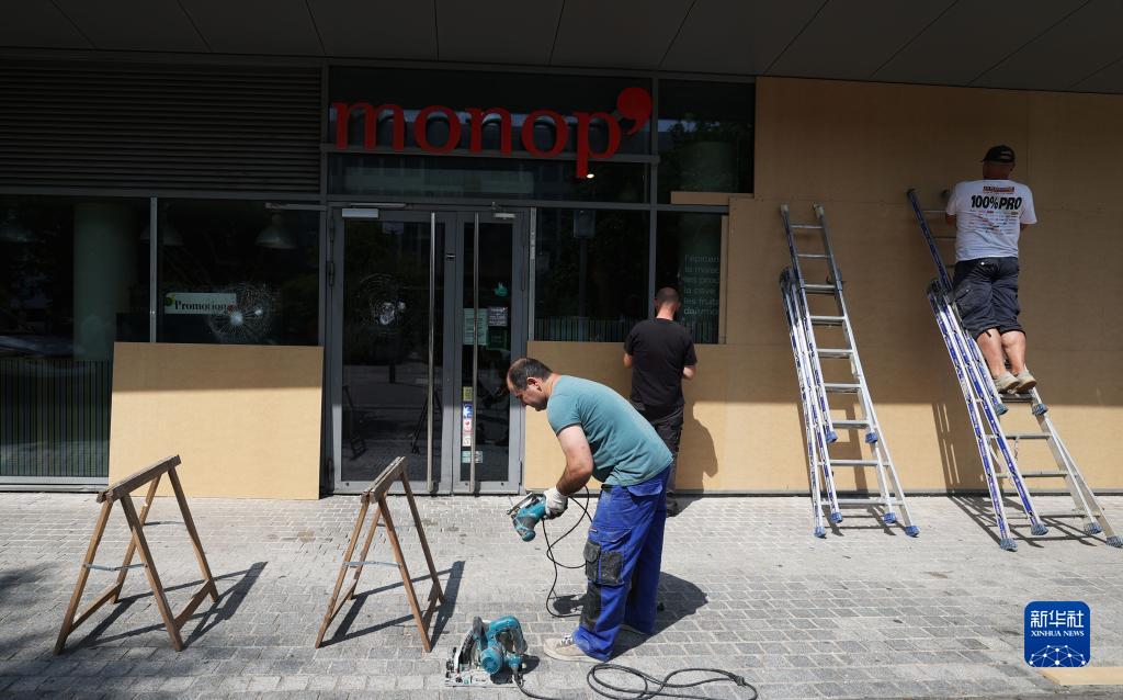 6月30日,在法國上塞納省楠泰爾市,工作人員為一家超市加裝防護板。