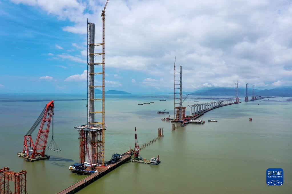 中交路建承建的黃茅??绾Mǖ栏邫诟鄞髽驏|主塔(左一)在海中5座主塔當中率先架設首榀鋼箱梁(6月29日攝,無(wú)人機照片)。