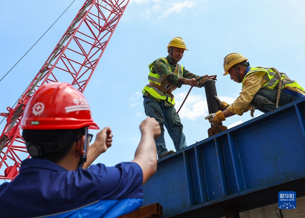 2023年1月9日,高欄港大橋東主塔在跨海通道大橋5座主塔中率先封頂。2023年6月19日,中交路建黃茅??绾Mǖ理椖坎吭诤V?座主塔率先完成首榀鋼箱梁架設,標志著(zhù)項目轉入上部結構施工階段。
