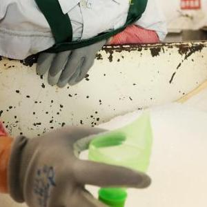 6月30日,在山東辛化硅膠有限公司,一位采購商在參觀(guān)貓砂產(chǎn)品。