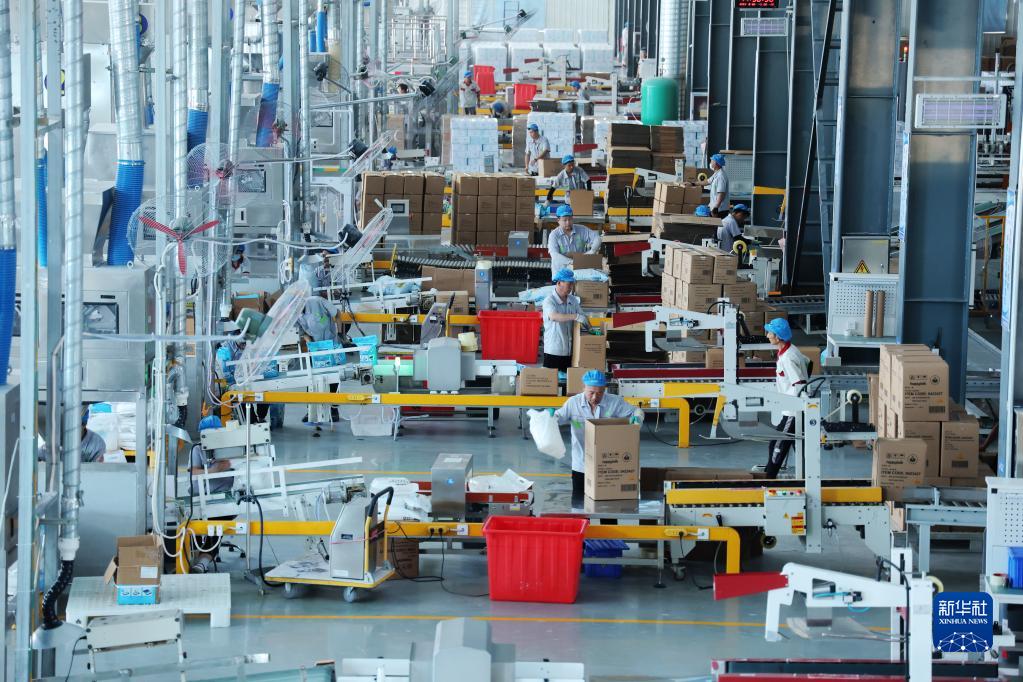 6月30日,在山東辛化硅膠有限公司,工人在生產(chǎn)出口的水晶貓砂。
