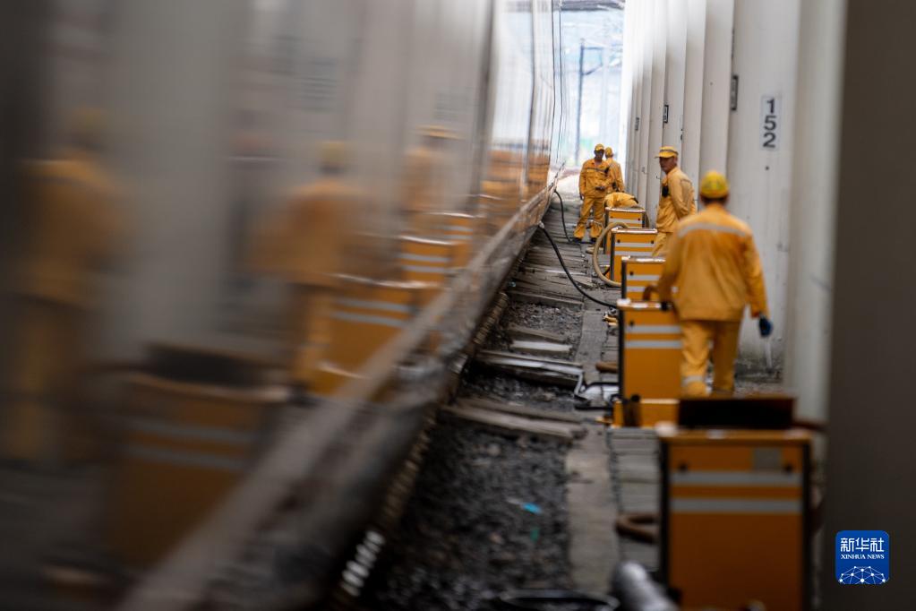 6月29日,溫州保潔工區的工人對??繙刂菽险镜母哞F列車(chē)進(jìn)行上水卸污作業(yè)。
