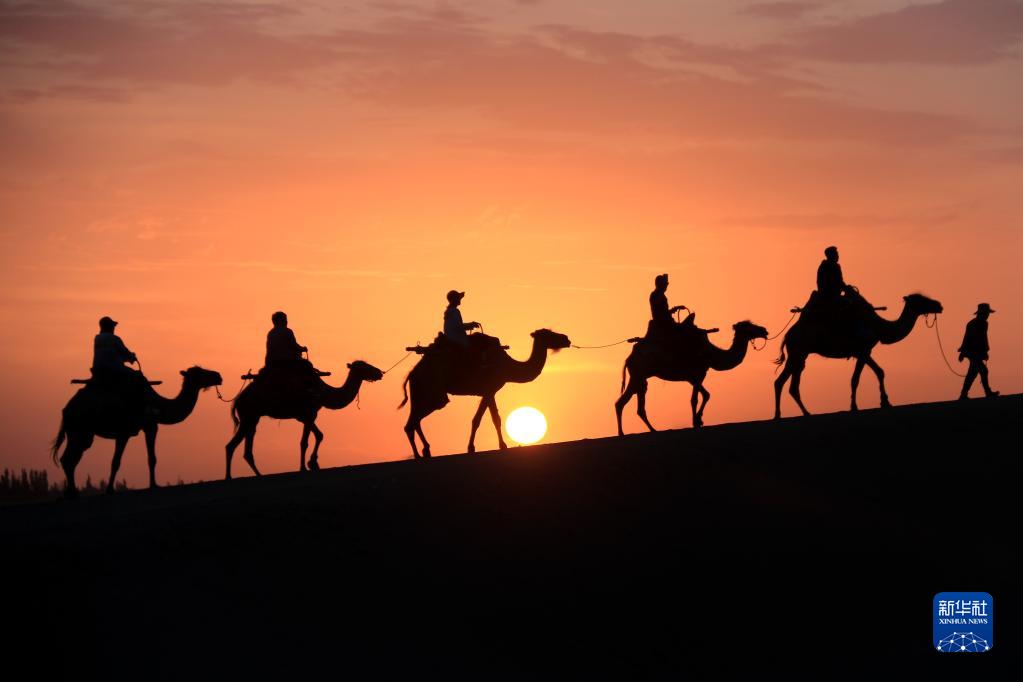 6月24日清晨,游客在甘肅省敦煌市鳴沙山月牙泉景區游覽。