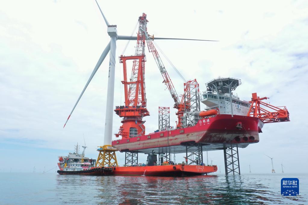 6月28日拍攝的全球首臺16兆瓦海上風(fēng)電機組吊裝現場(chǎng)(無(wú)人機照片)。