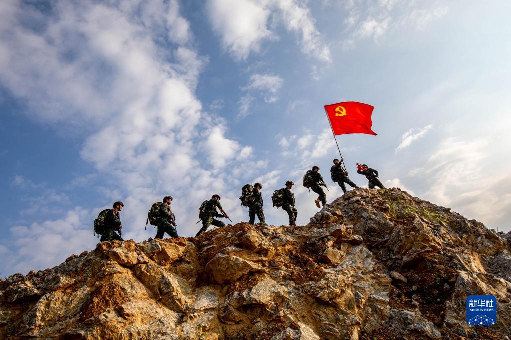 武警廣西總隊賀州支隊組織搶占制高點(diǎn)訓練,黨員先鋒隊率先登頂(6月30日攝)。