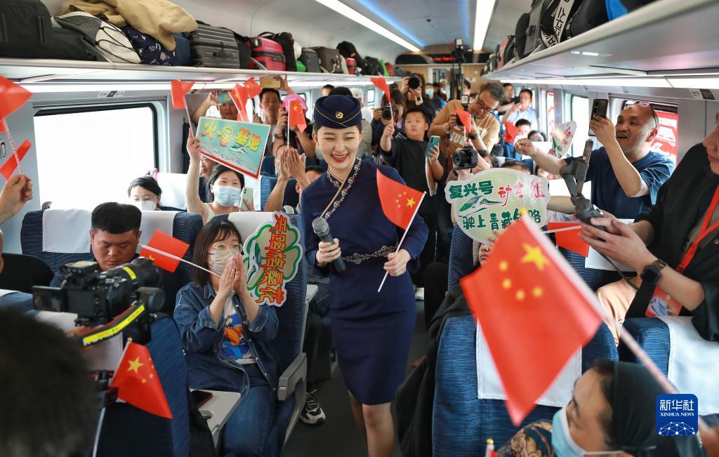 7月1日,在C891次西寧至格爾木動(dòng)車(chē)組列車(chē)上,乘務(wù)員與乘客互動(dòng)。