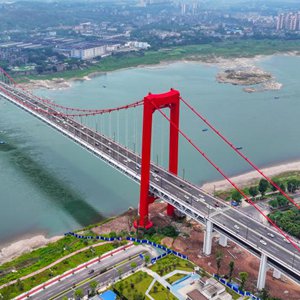 當日,四川瀘州長(cháng)江二橋建成通車(chē)。該橋長(cháng)1016米、主跨576米,是瀘州首座雙層公軌兩用懸索橋。新華社發(fā)(劉學(xué)懿攝)