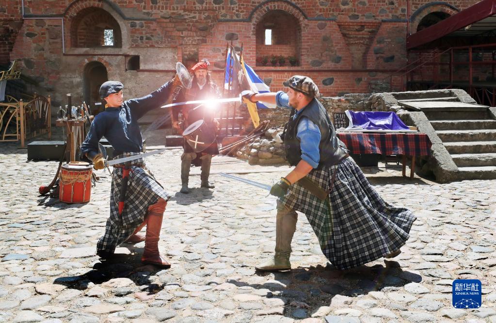 6月30日,演員在白俄羅斯格羅德諾州米爾鎮米爾城堡表演古代格斗。