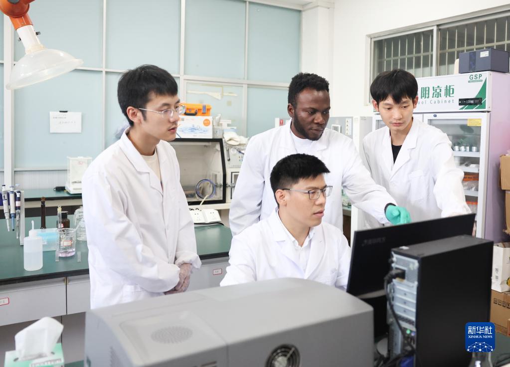 6月26日,在湖南農業(yè)大學(xué)環(huán)境微生物學(xué)實(shí)驗室,尼克(右二)在導師周耀渝(左二)的指導下和同學(xué)們一起查看實(shí)驗結果。